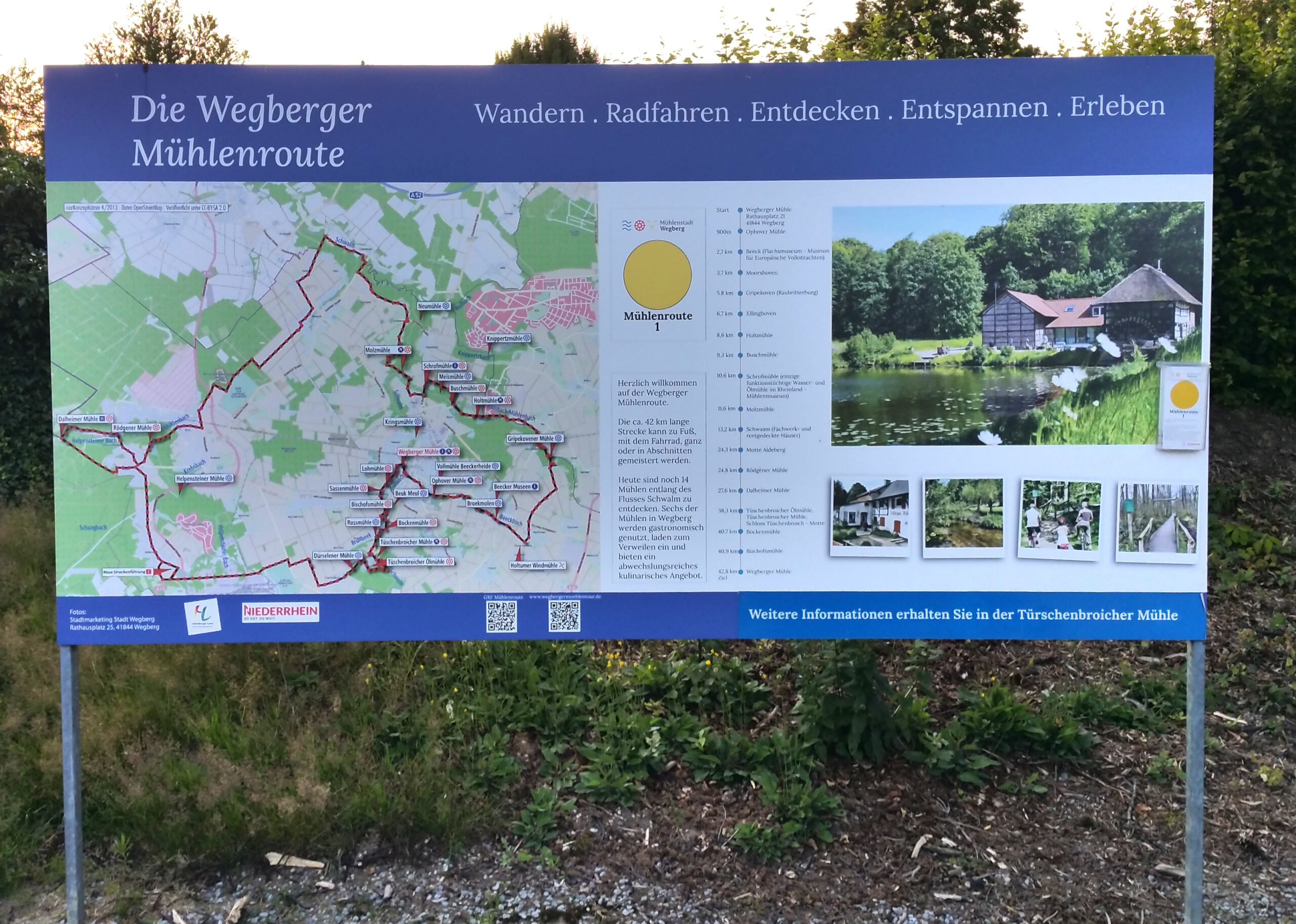 Wegweiser der Wegberger Mühlenroute am Schloss Tüschenbroich.
